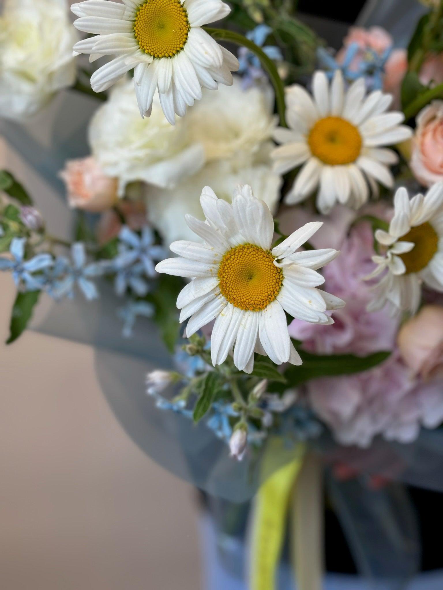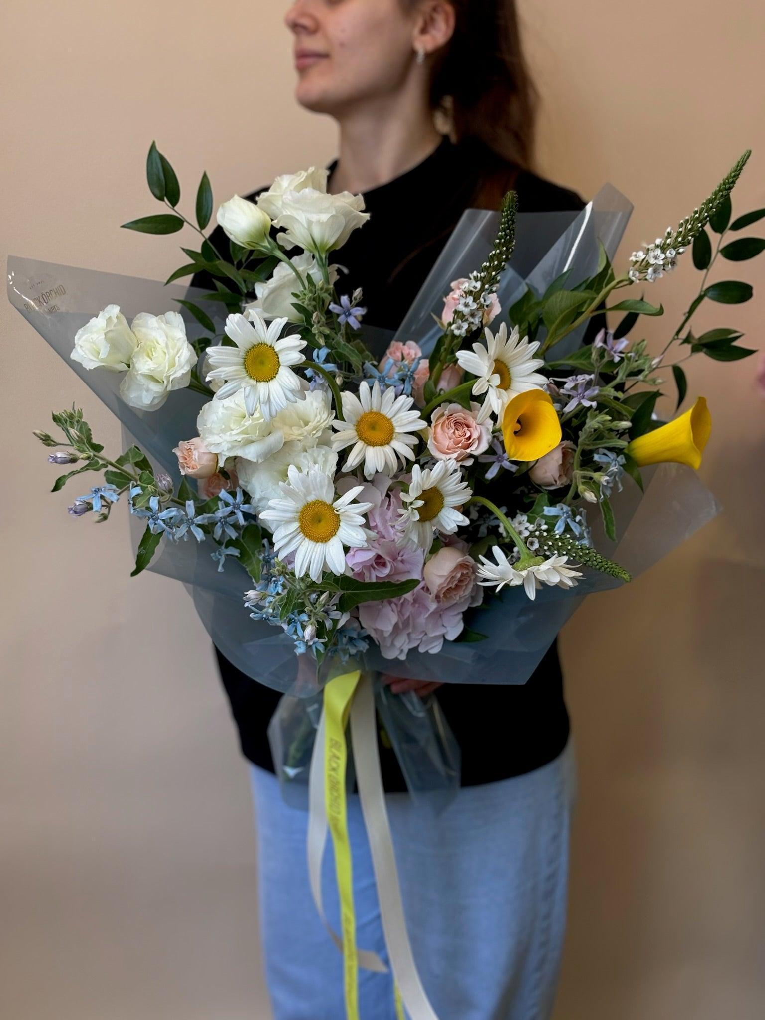 Seasonal bouquet of summer's favorite flowers. daisy, calla lily, lisianthus, hydrangea, spray garden roses. In custom wrapping.
