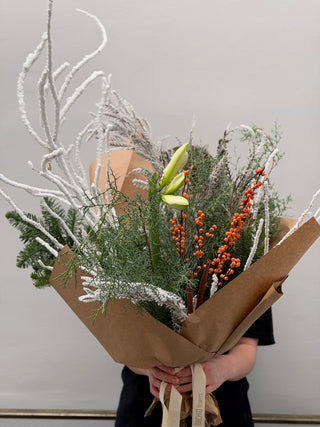 Candy cane-striped amaryllis brings playful elegance to formal dining tables. Silver-dusted eucalyptus adds sophisticated texture to every arrangement. We offer sizes from intimate accent pieces to grand entrance displays. Custom color palettes accommodate any holiday decorating scheme or preference.