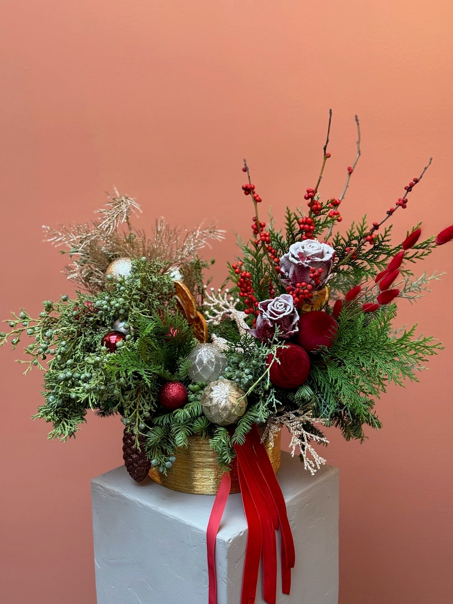 Christmas arrangement in gold vase with red and gold ornament