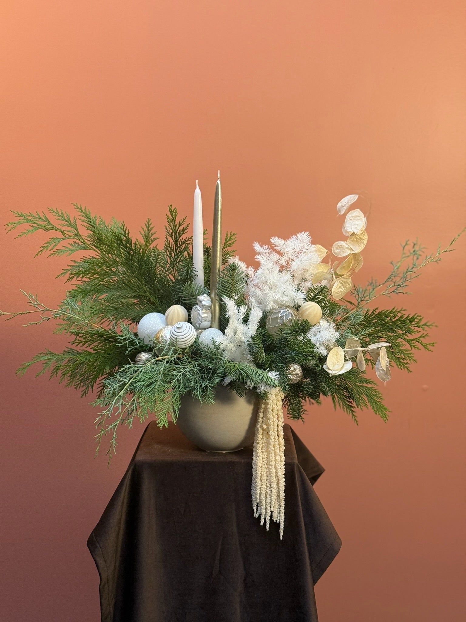 Christmas arrangement in ceramic vase with cedar, juniper and Carolina. Included preserver lunaria and ming fern. With white and gold ornament. Including candles (just for decor, don't recumbent to light, can cause fire)