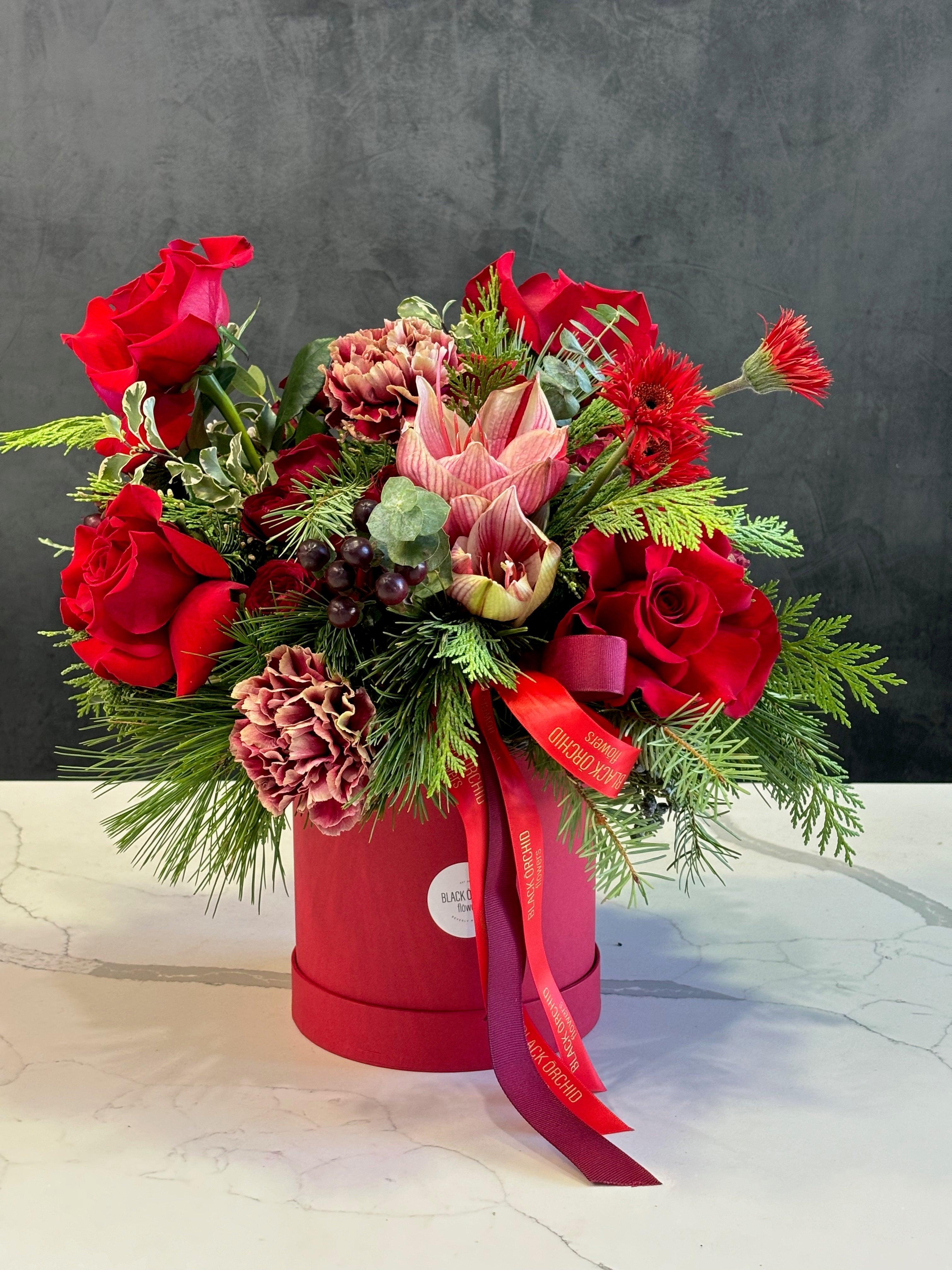 This festive and bright arrangement with winter's favorite flowers amaryllis , dianthus, ilex berries, princess pine, noble fir. Comes in a red custom box.