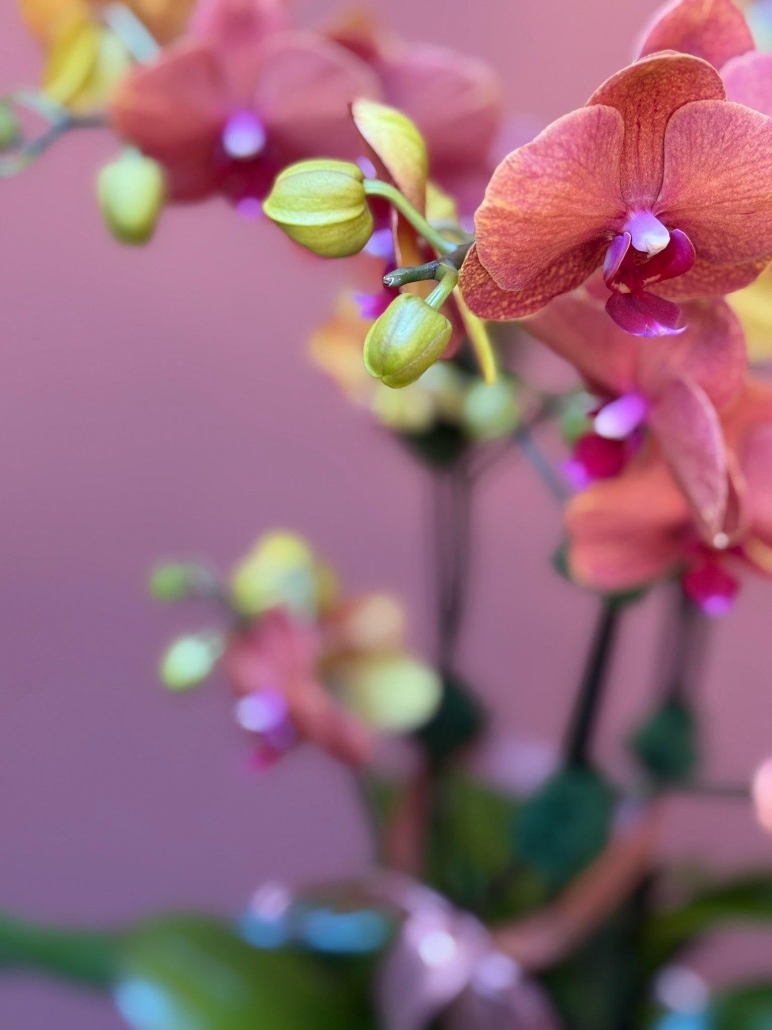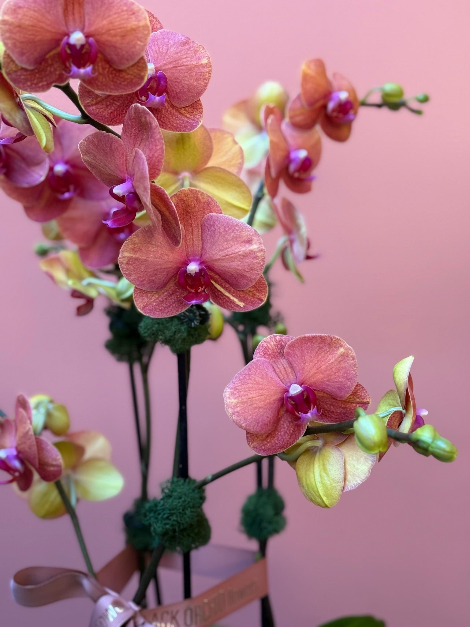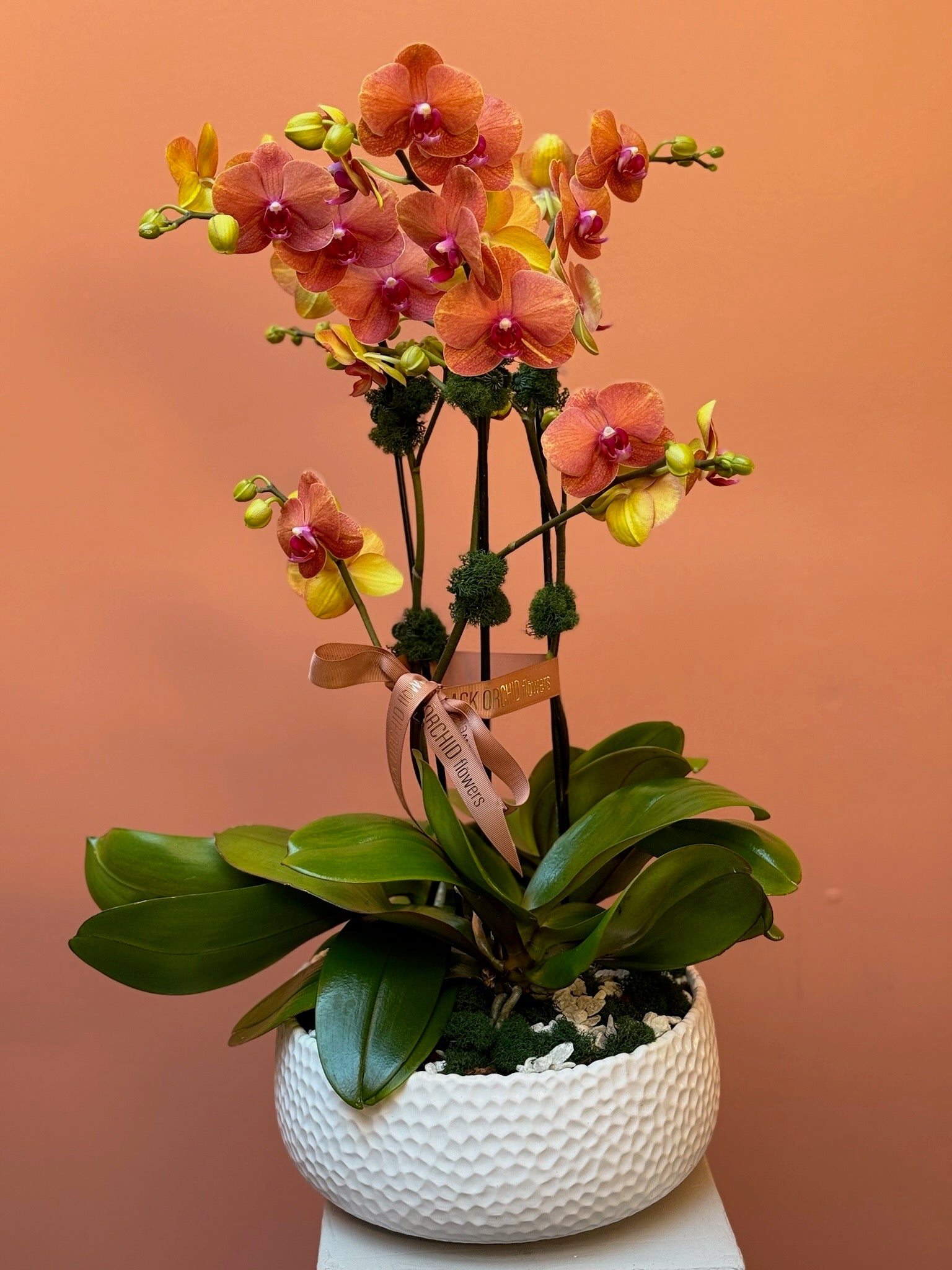 Three orange colored orchids planted in white modern ceramic vase . Great home decor
