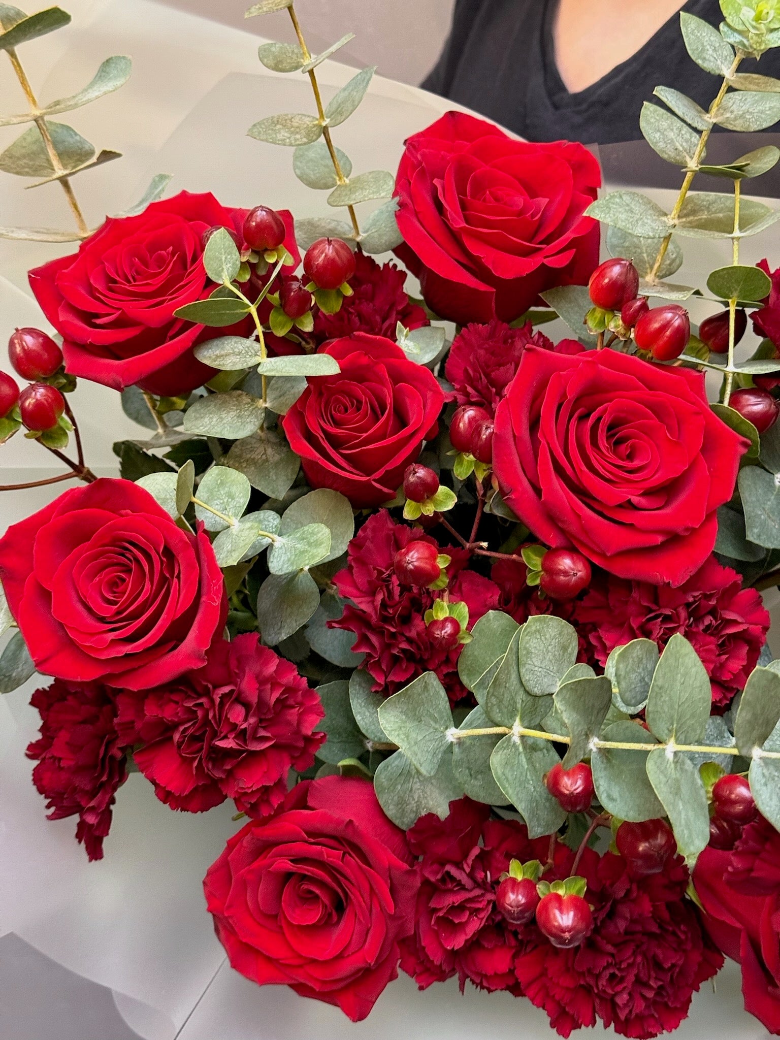 Bouquet of red premium red roses with beautiful burgundy dianthus, hypericum and eucalyptus.